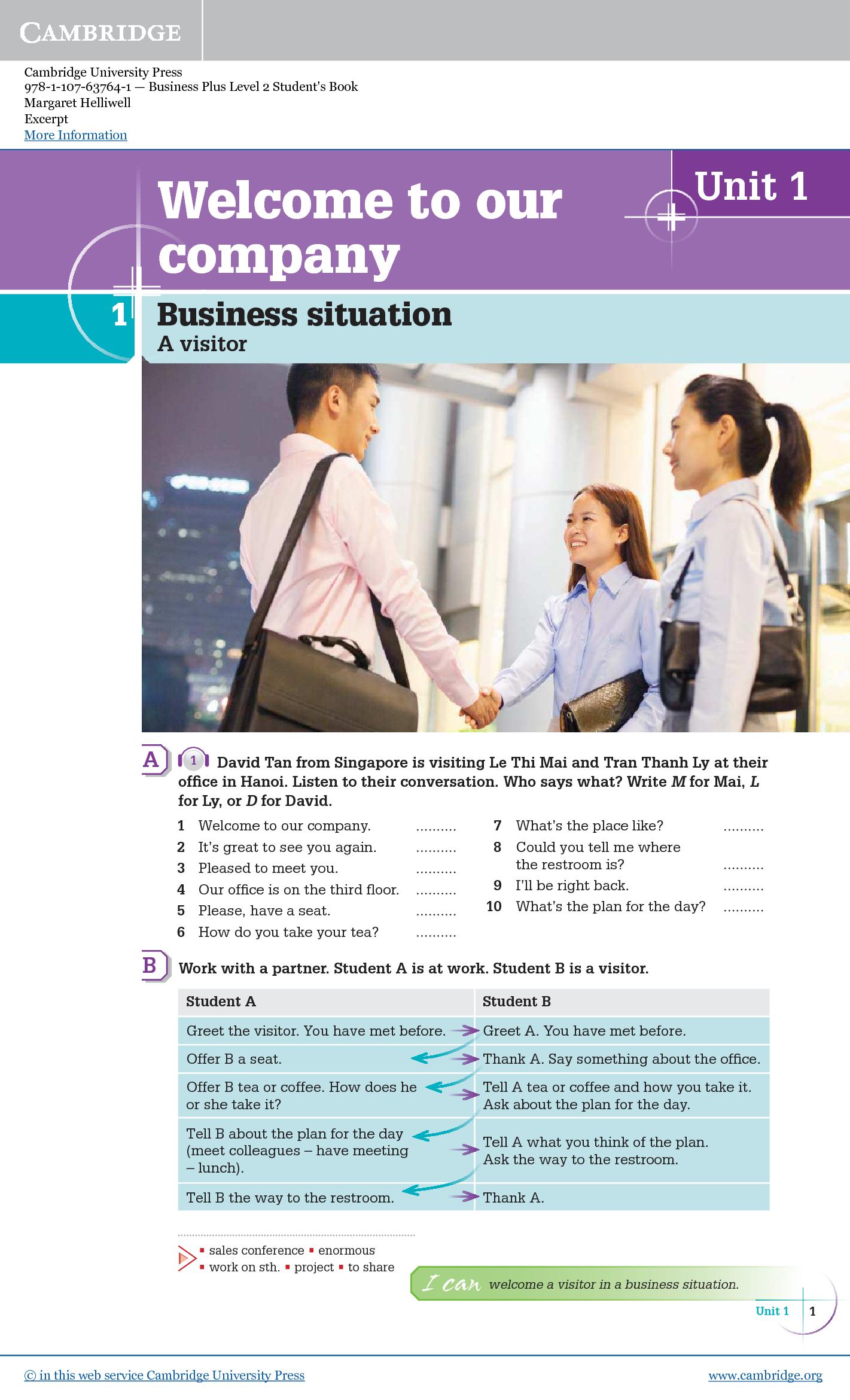 Business Plus is a three-level, integrated-skills, business English course, from A1 (false beginner) to B1 (pre-intermediate) levels. Each level of the Student's Book has 10 units. Designed to be easy and enjoyable to teach, each unit features integrated skills and language practice. Units also include cultural awareness sections that connect learners to their region and beyond. In addition, TOEIC-style practice sections allow students' progress to be measured.