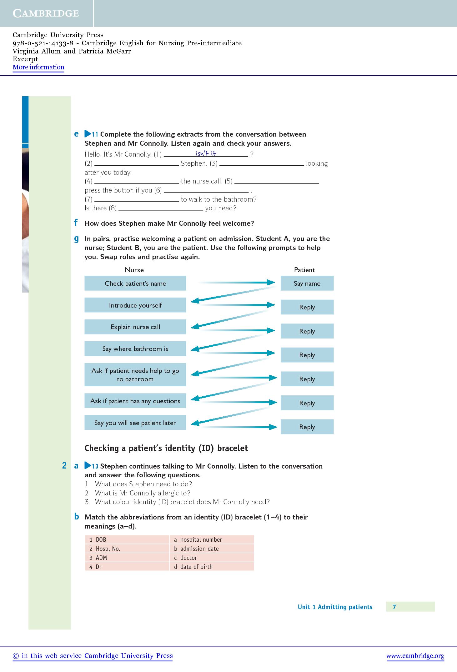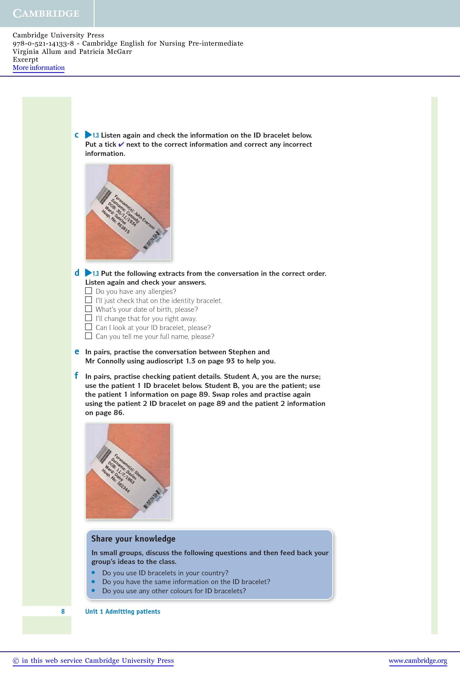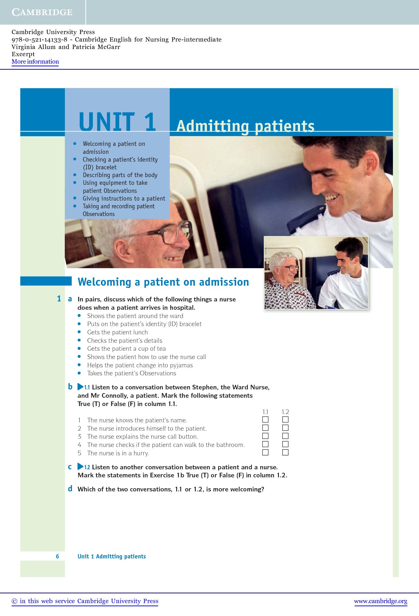 Cambridge English for Nursing is designed to improve the communication skills and specialist English language knowledge of healthcare professionals, enabling them to work more confidently and effectively. With an emphasis on listening and speaking, the course covers core areas of nursing such as patient admission, taking medical specimens, patient handover, post-operation assessment and discharge planning. Authentic tasks and activities based on everyday nursing scenarios - from dealing with patients in pain to discussing lifestyle changes - make the course relevant and motivating. The course also features online activities which focus on the latest advances in nursing technology. These help to keep nurses up-to-date and confident when faced with unfamiliar equipment in new environments. This course requires no specialist knowledge on the part of the teacher as comprehensive teacher's notes are available online. It is also ideal for self-study for healthcare professionals without the time to attend a teacher-led programme.