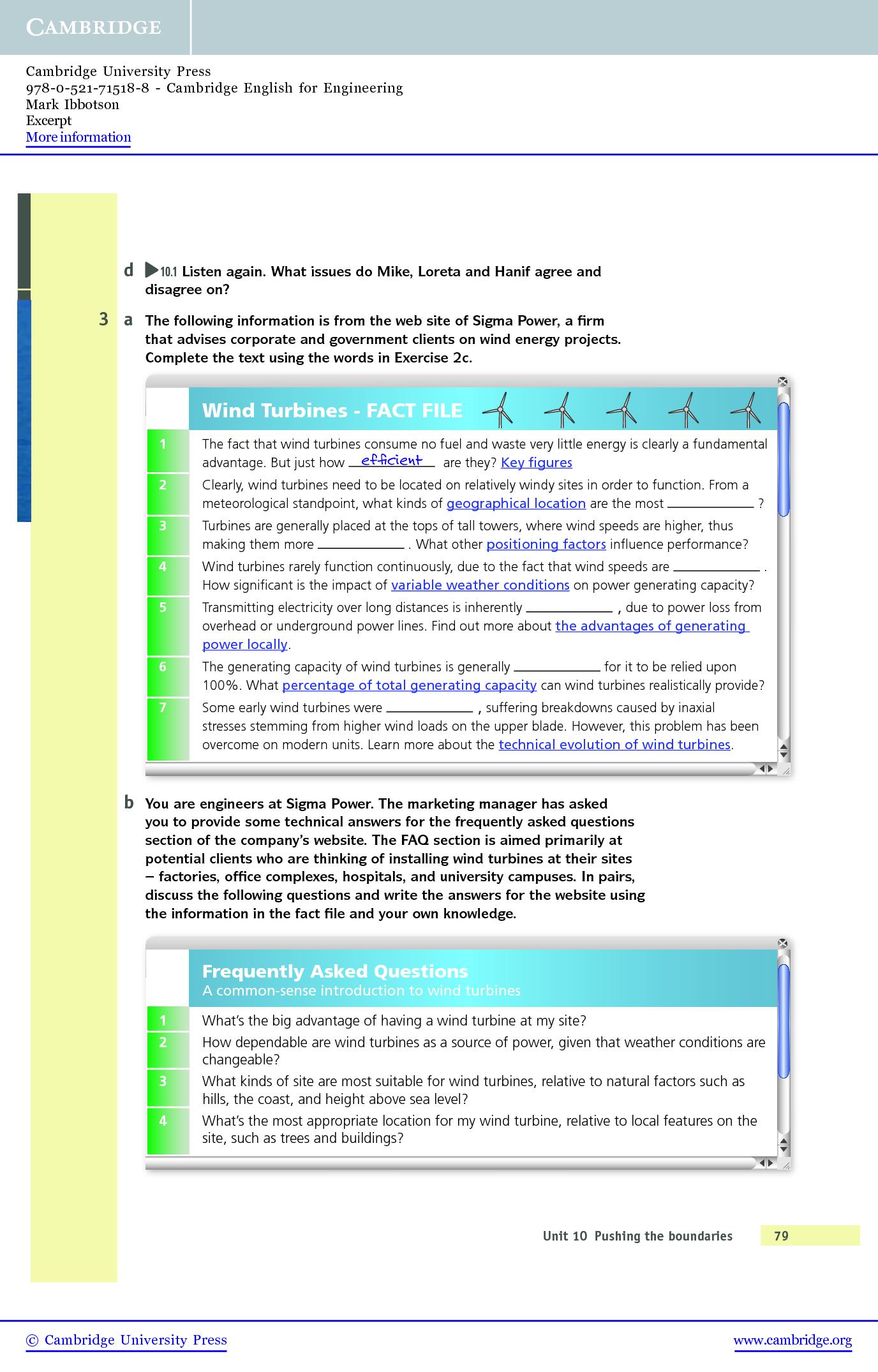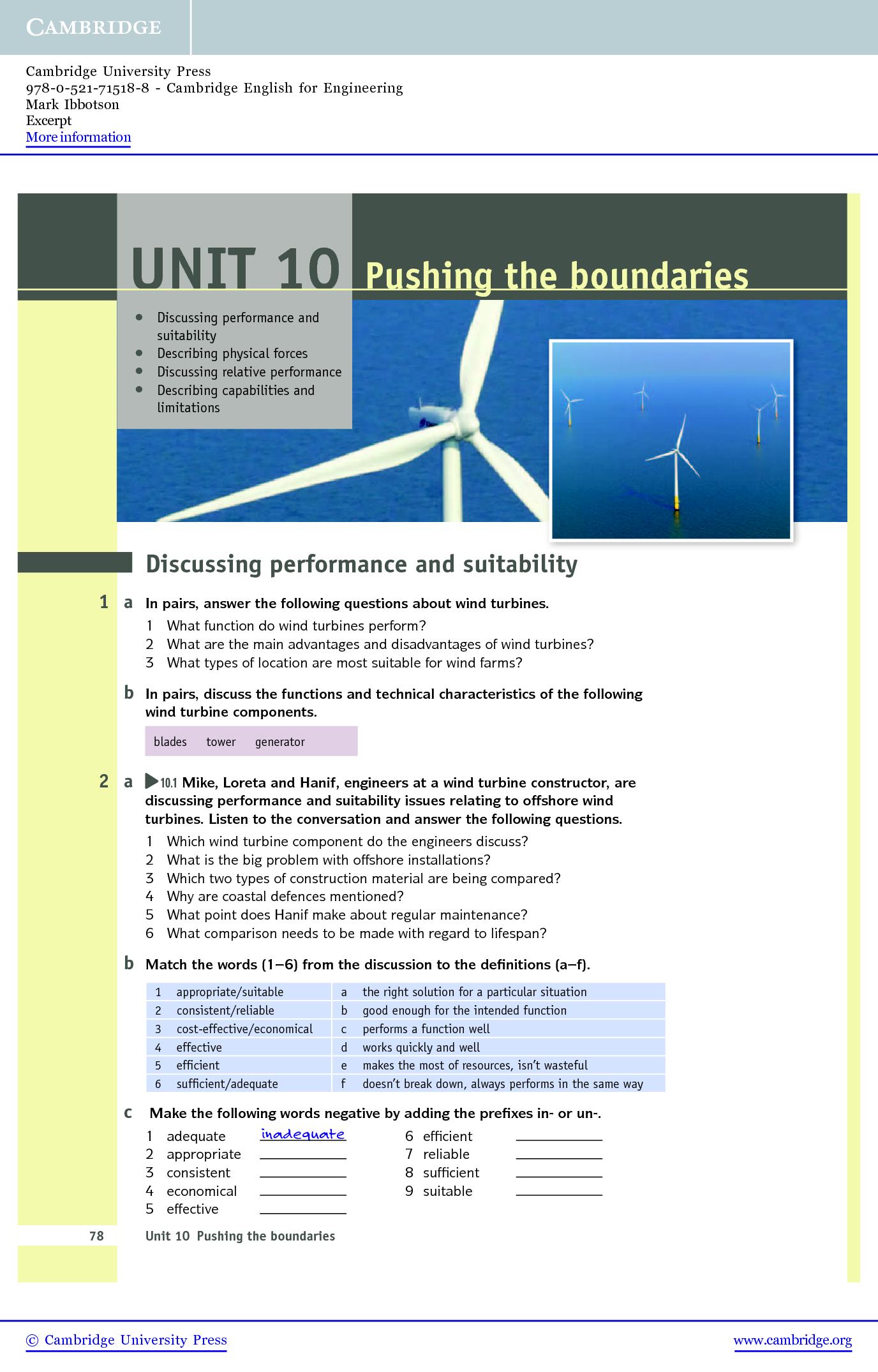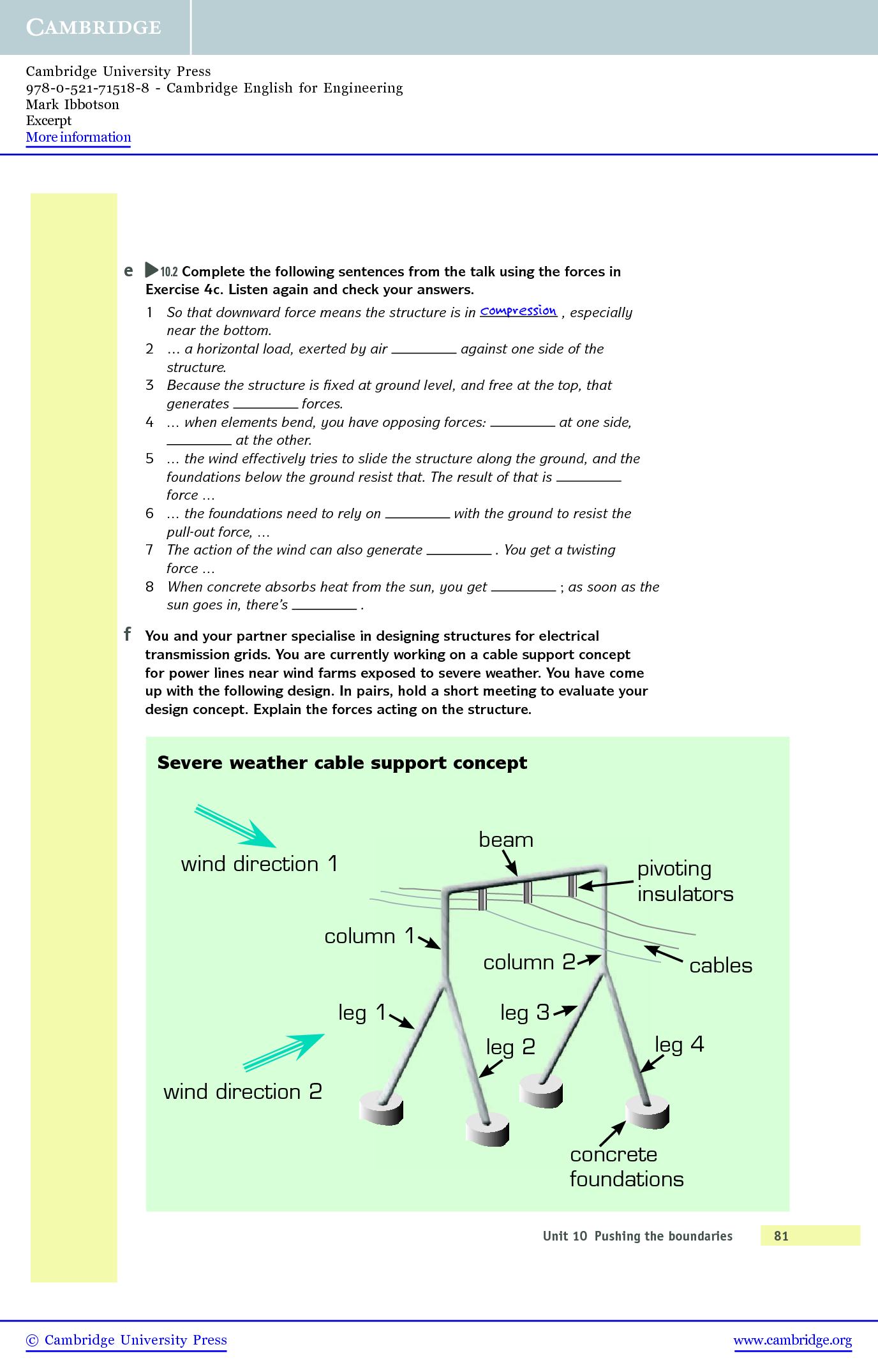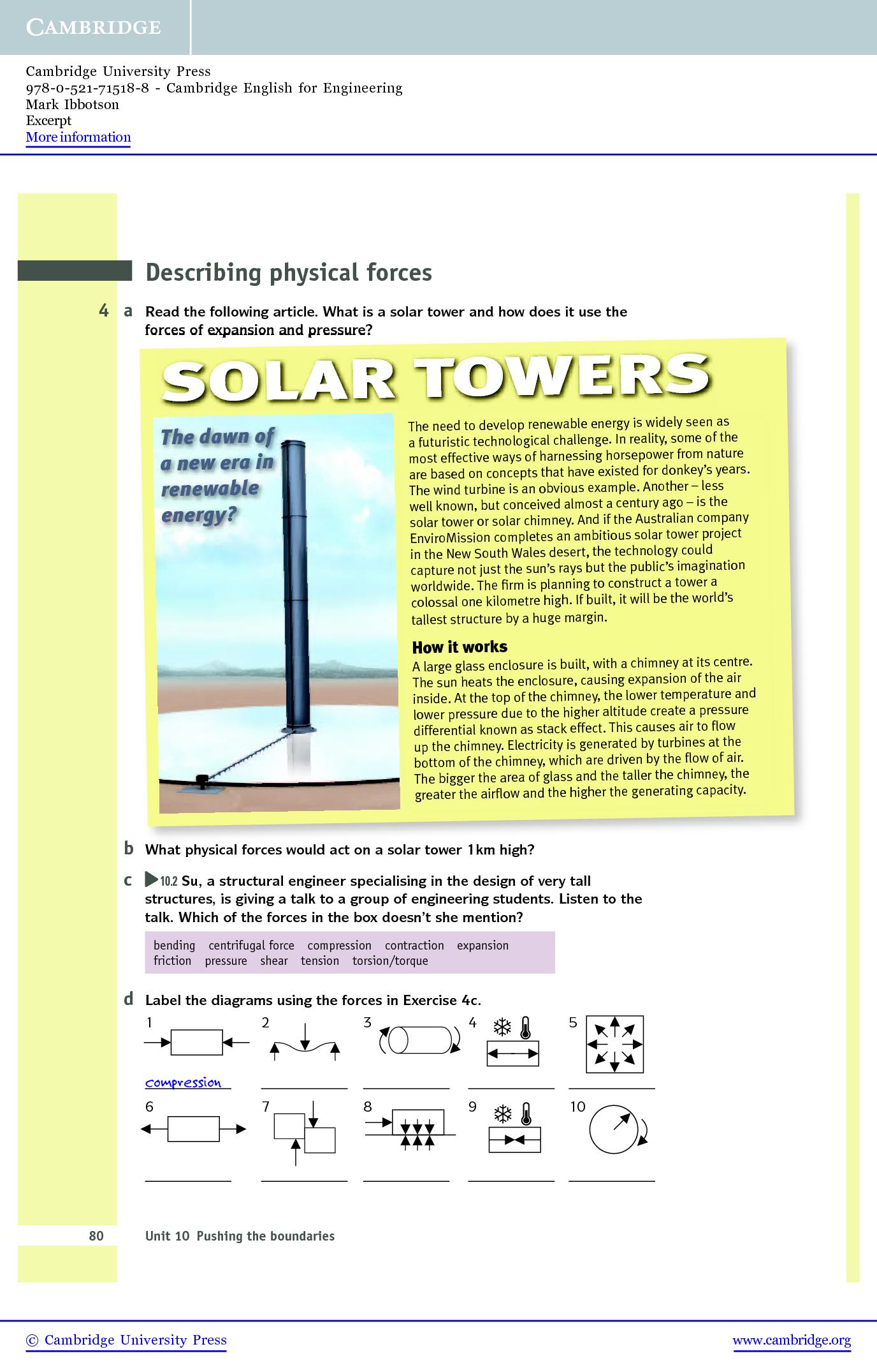 The ten standalone units cover topics common to all kinds of engineering (including civil, electrical and mechanical) such as procedures and precautions; monitoring and control; and engineering design. Authentic activities, from describing technical problems and suggesting solutions to working with drawings, make the course relevant and motivating.