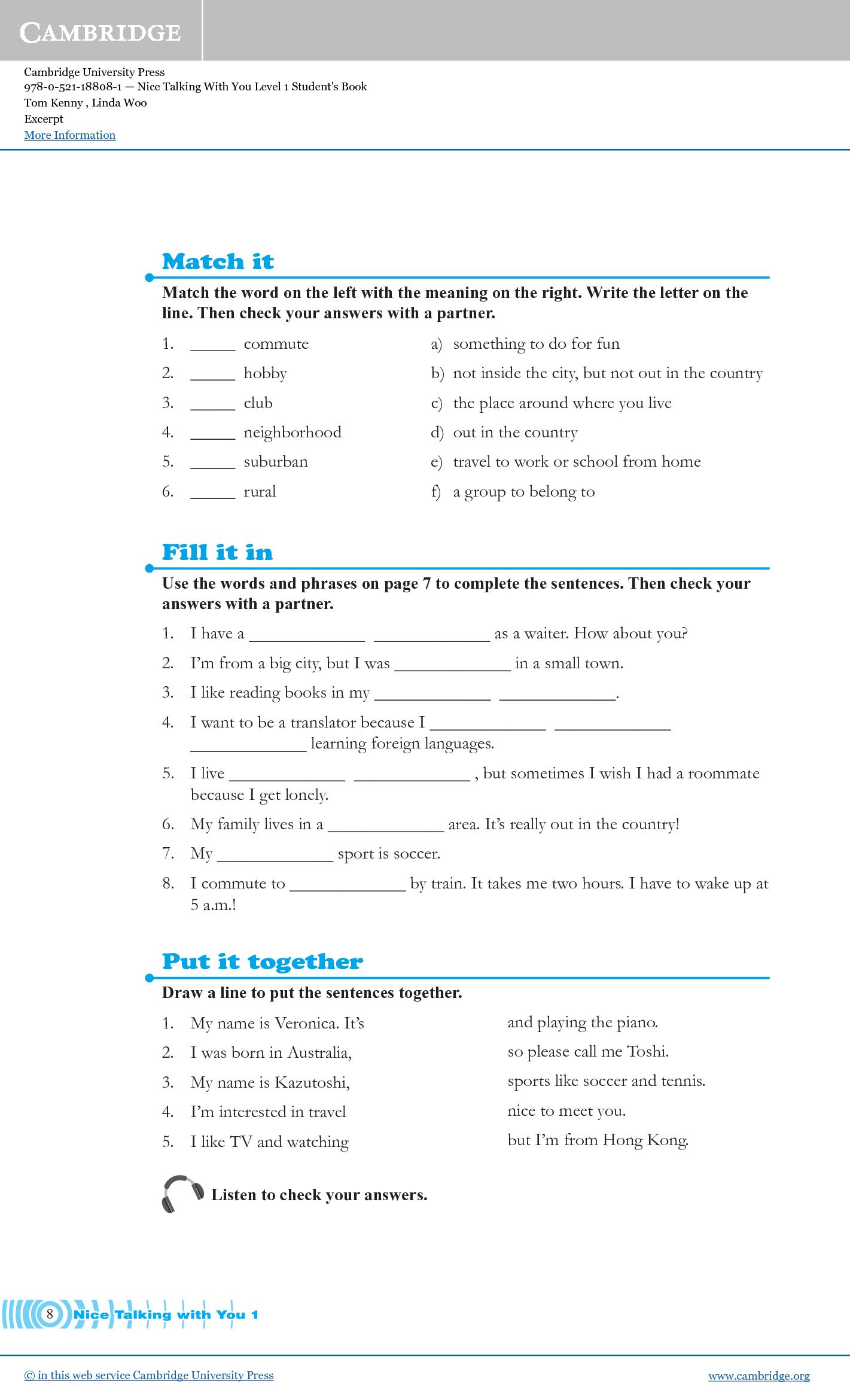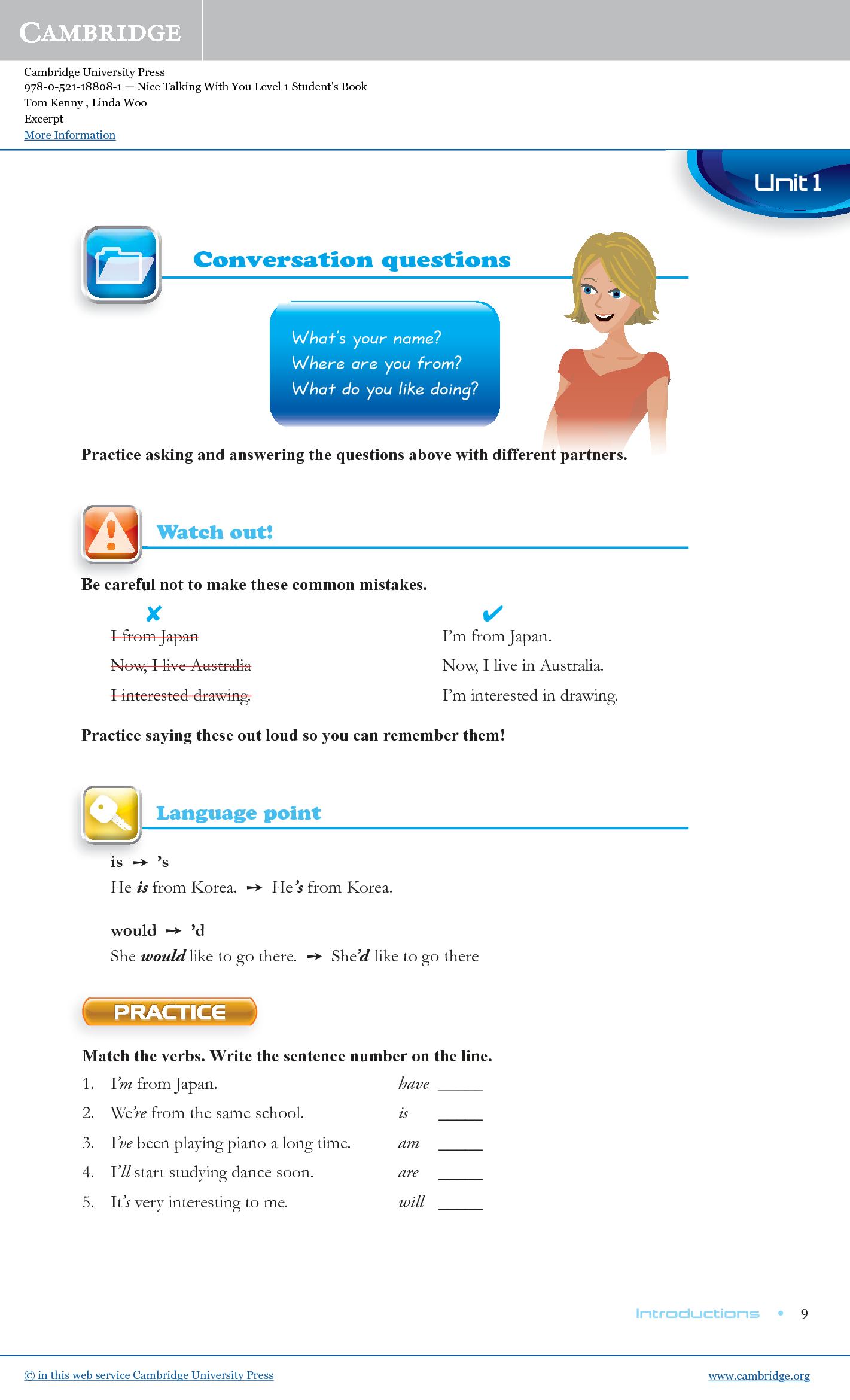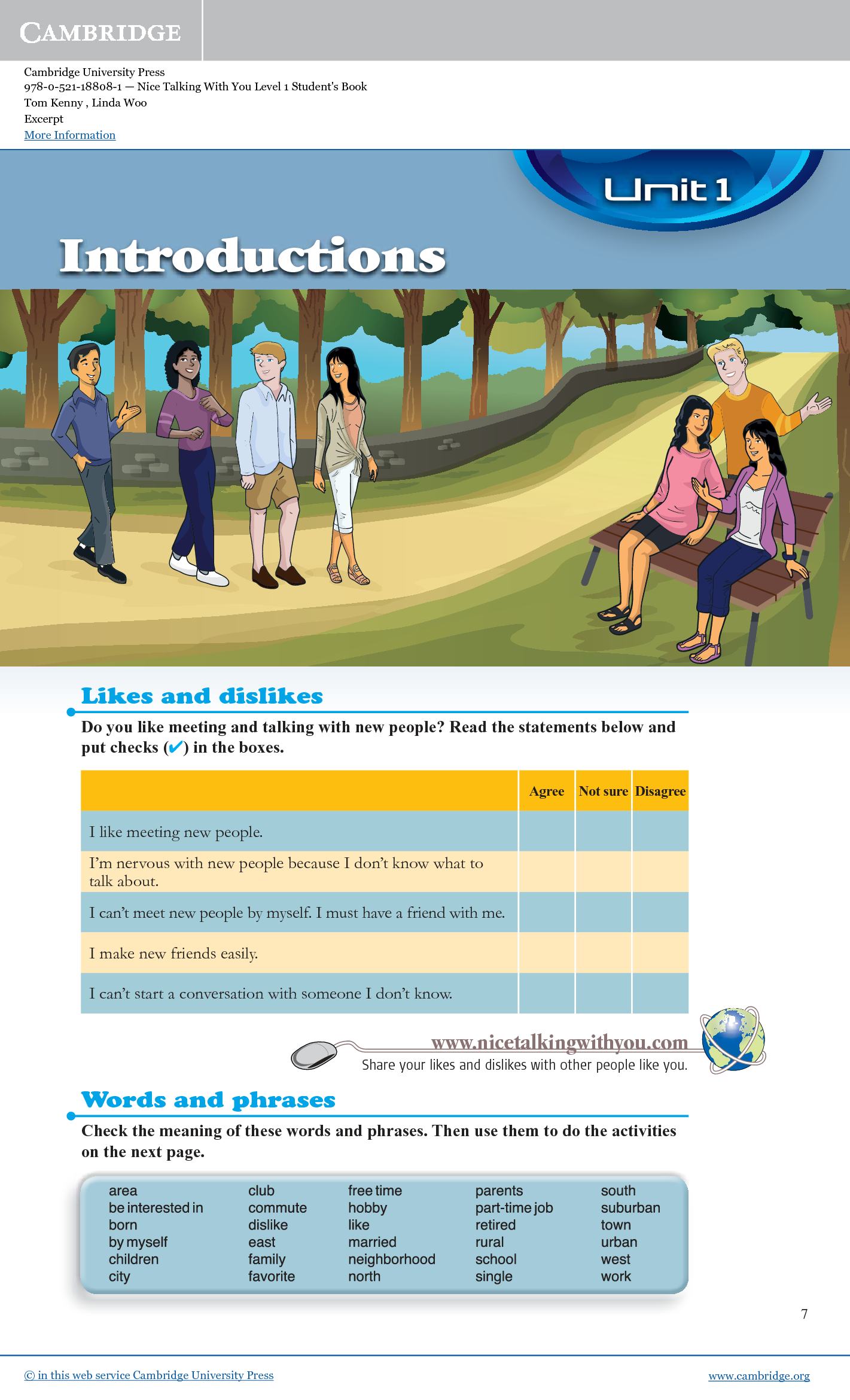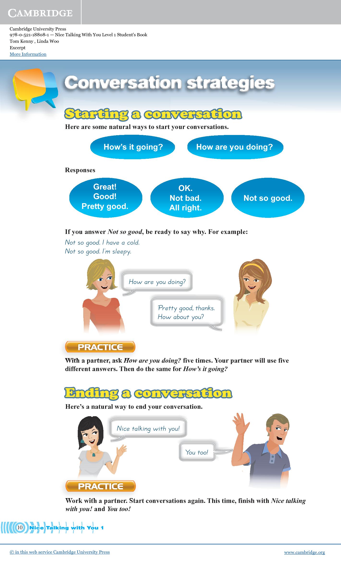 Nice Talking with You is a two-level oral communication series designed to get students talking and keep them talking in English from the very first class. Each unit features practical conversation strategies to create a unique, fluency-first approach, helping learners become confident speakers of natural English. Strategies include reacting in English, fixing communication problems, beginning and ending a conversation, and keeping a conversation going.