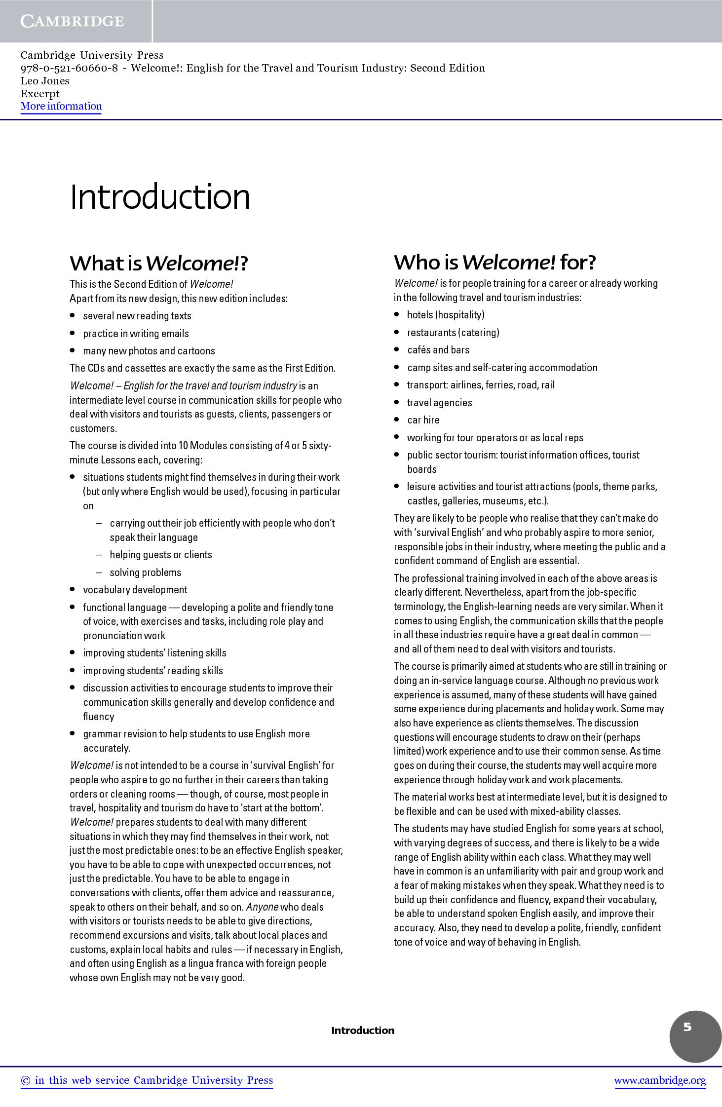 Welcome! is an intermediate level course for people who need to use or who are preparing to use English in their day-to-day work in the tourism, hospitality and travel industries.