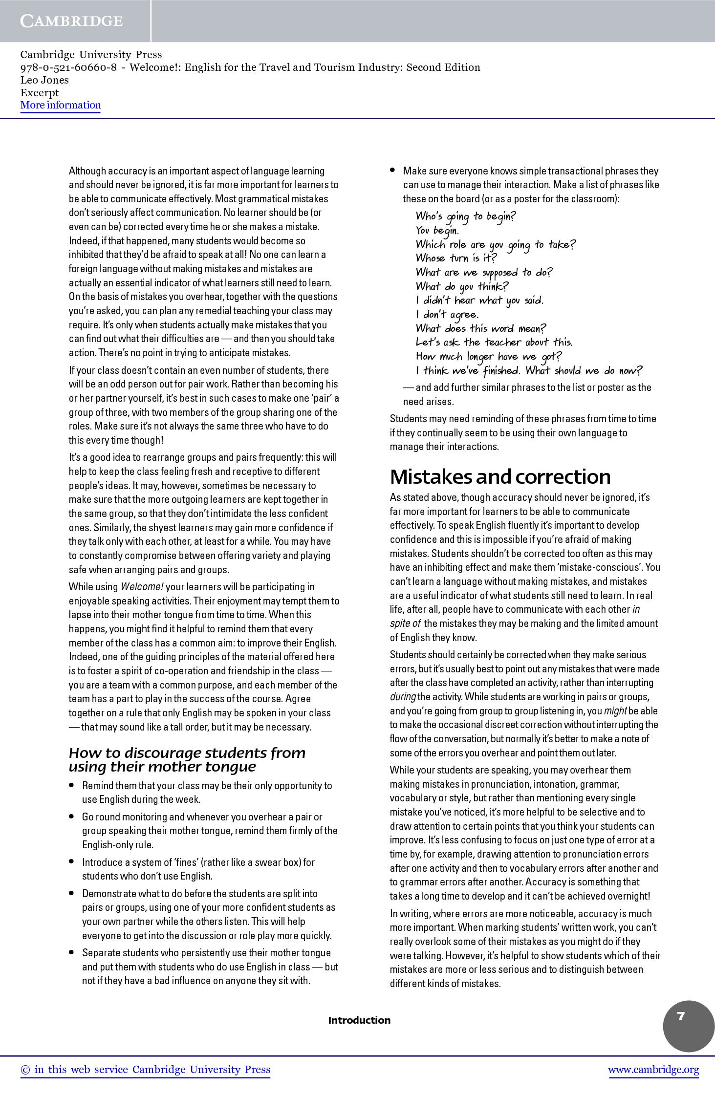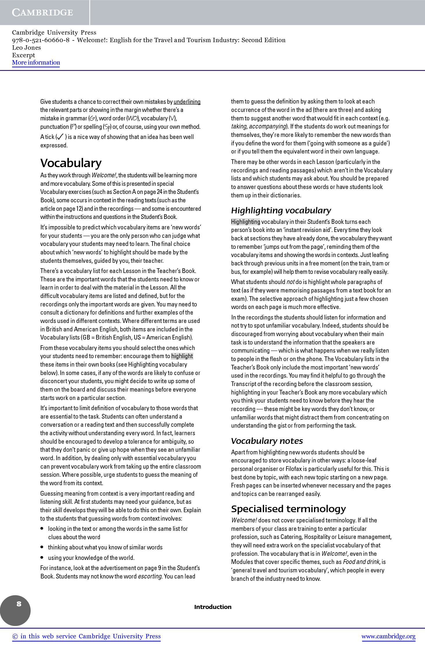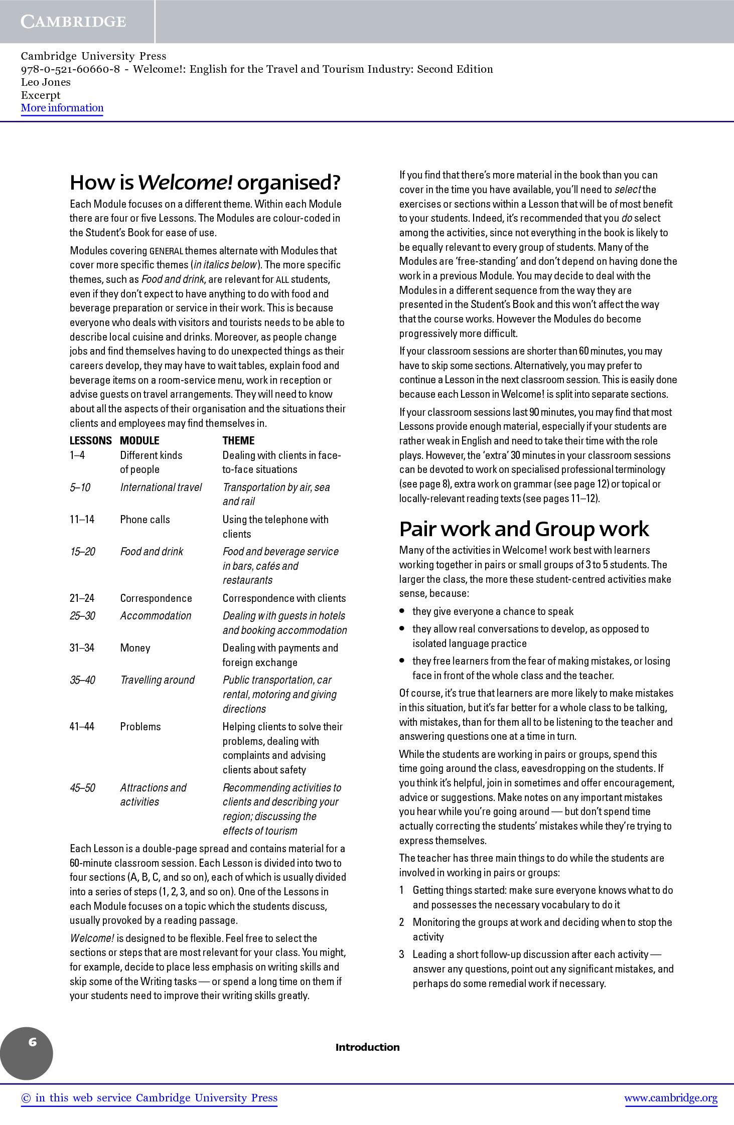 Welcome! is for people working or planning to work in the tourism, hospitality and travel industries. The core language skills are developed through a wide range of work-related tasks. Particular emphasis is placed on realistic and integrated communication tasks which give students the opportunity to build confidence and improve fluency. The second edition includes updated content, extensive practice in writing emails and further communication activities aimed specifically at busy professionals.