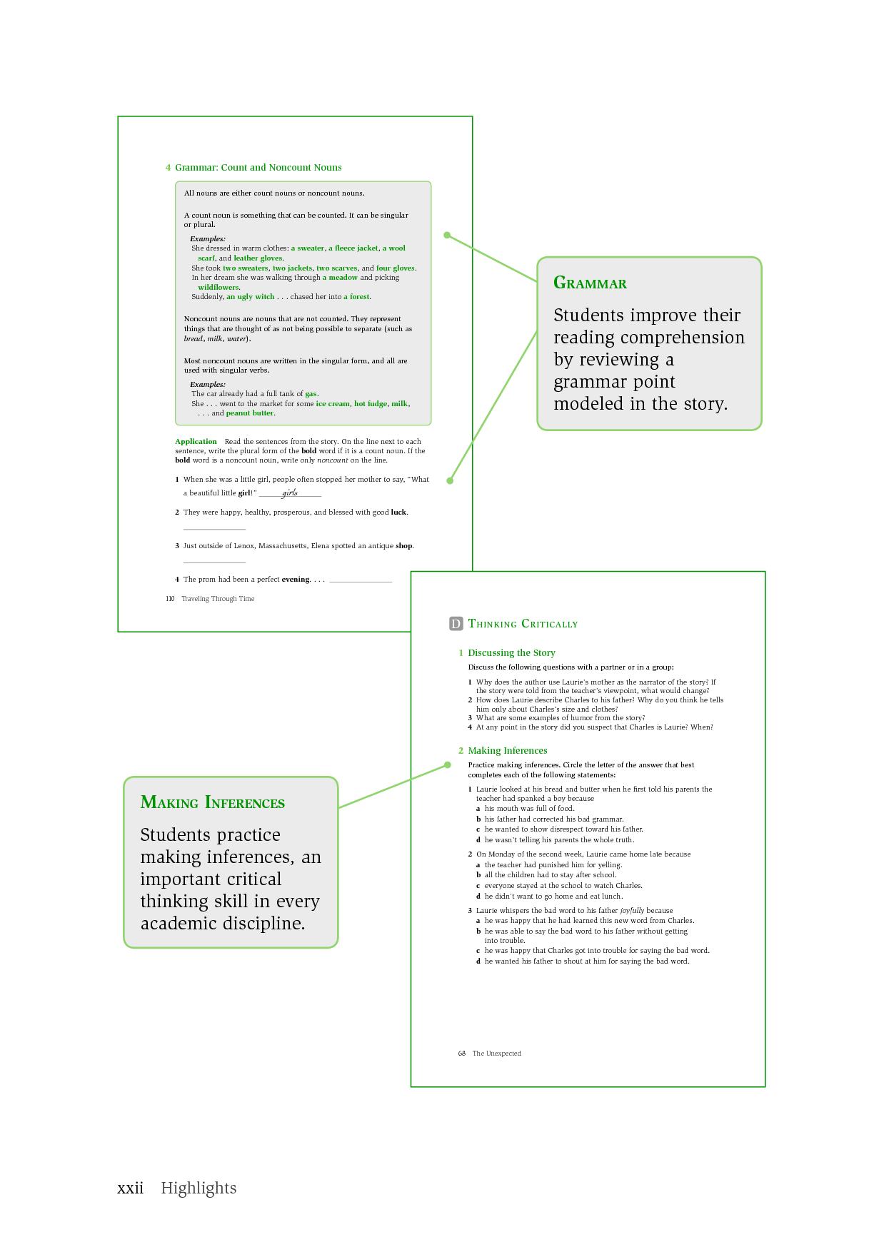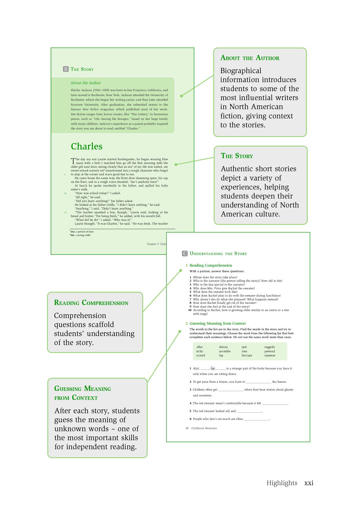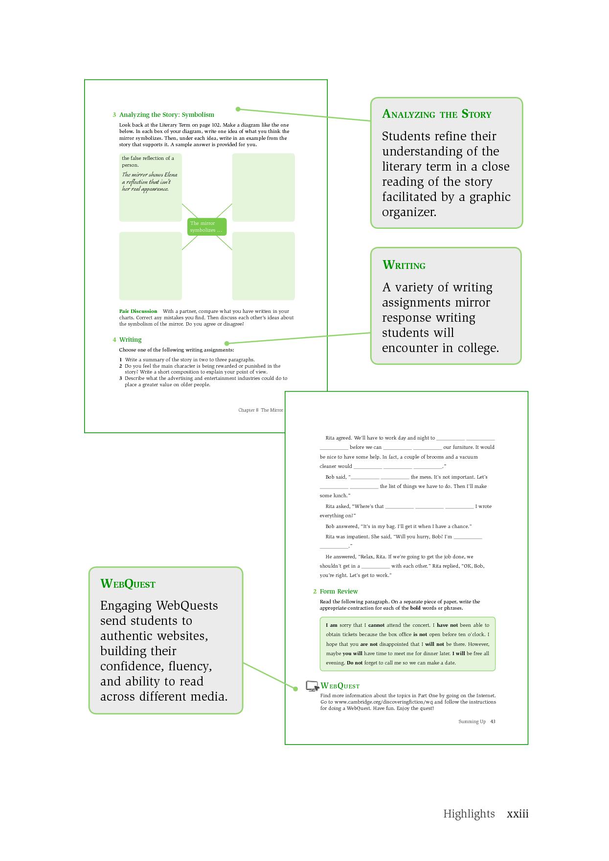 Discovering Fiction is a three-level anthology of short stories by contemporary and classic American authors such as Isaac Asimov, Edgar Allen Poe, Sandra Cisneros, Kate Chopin, Ernest Hemingway, Langston Hughes, and Mark Twain. The texts provide interactive, skill-building tasks around each story. Extensive pre-reading activities capture students' interest, comprehension activities check students' understanding, and grammar and vocabulary tasks increase students' language knowledge. Thought-provoking discussion and writing assignments enhance students' ability to interpret and appreciate literature. In addition, WebQuests take students beyond the reading to expand their knowledge of the topic while building Internet reading skills.