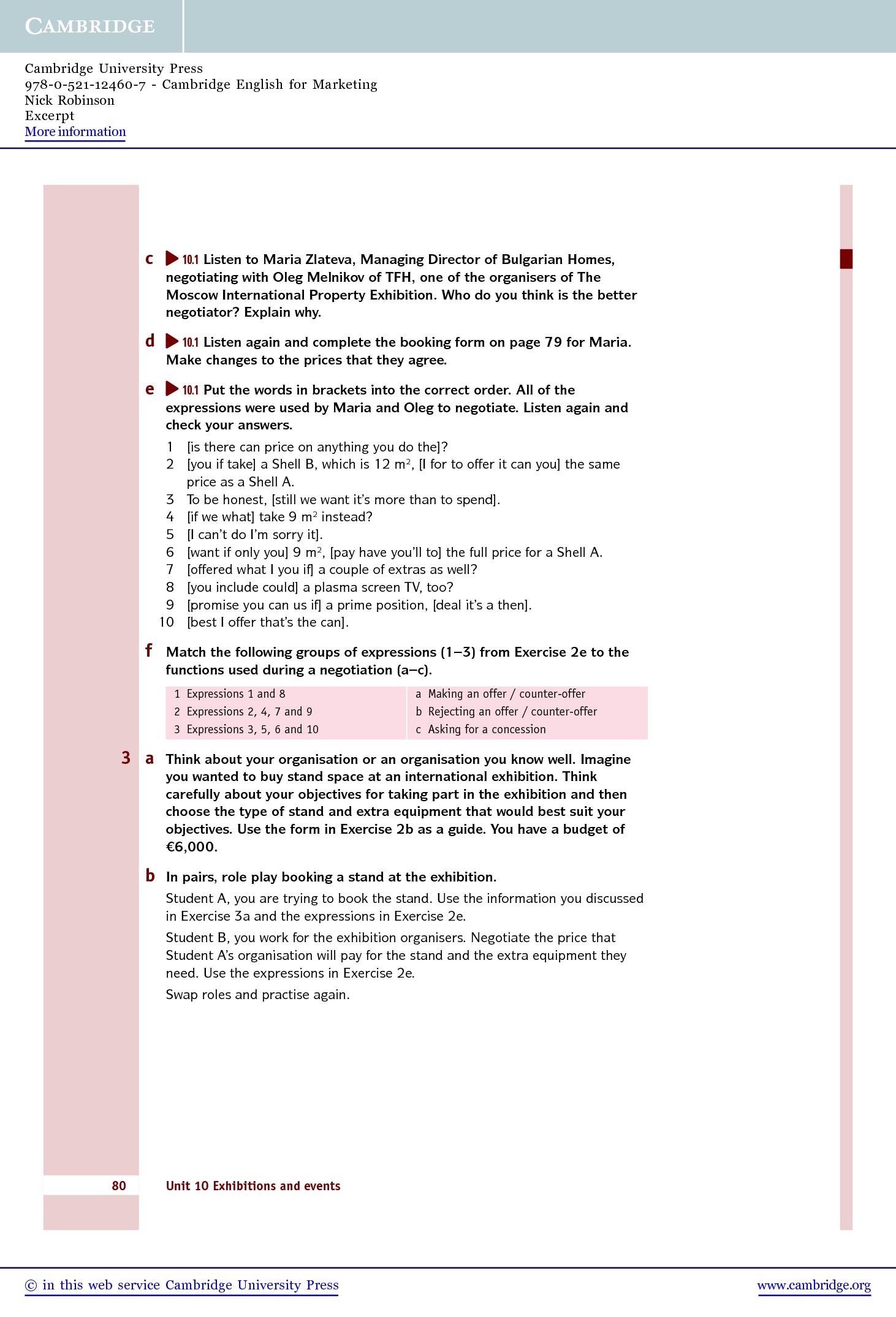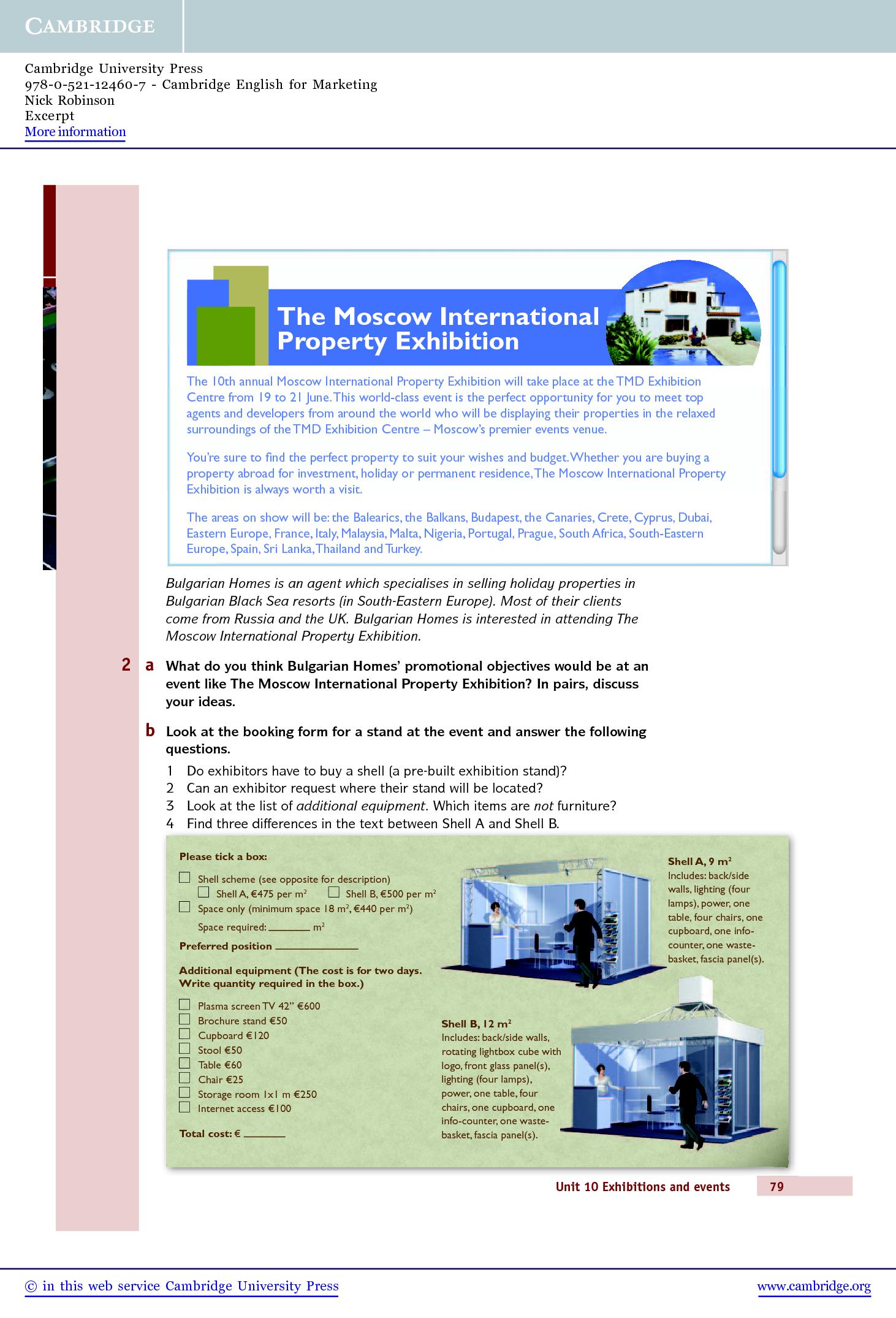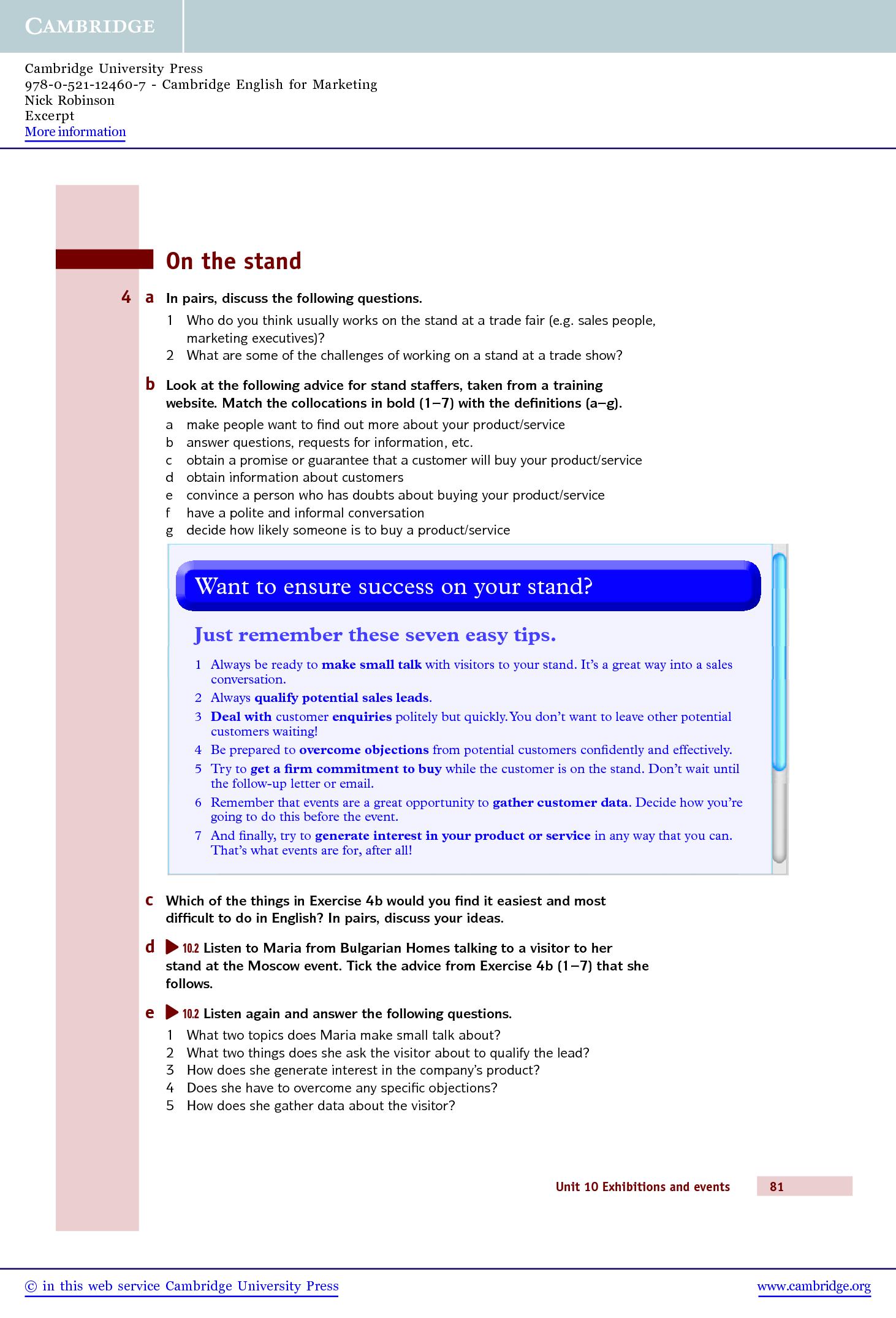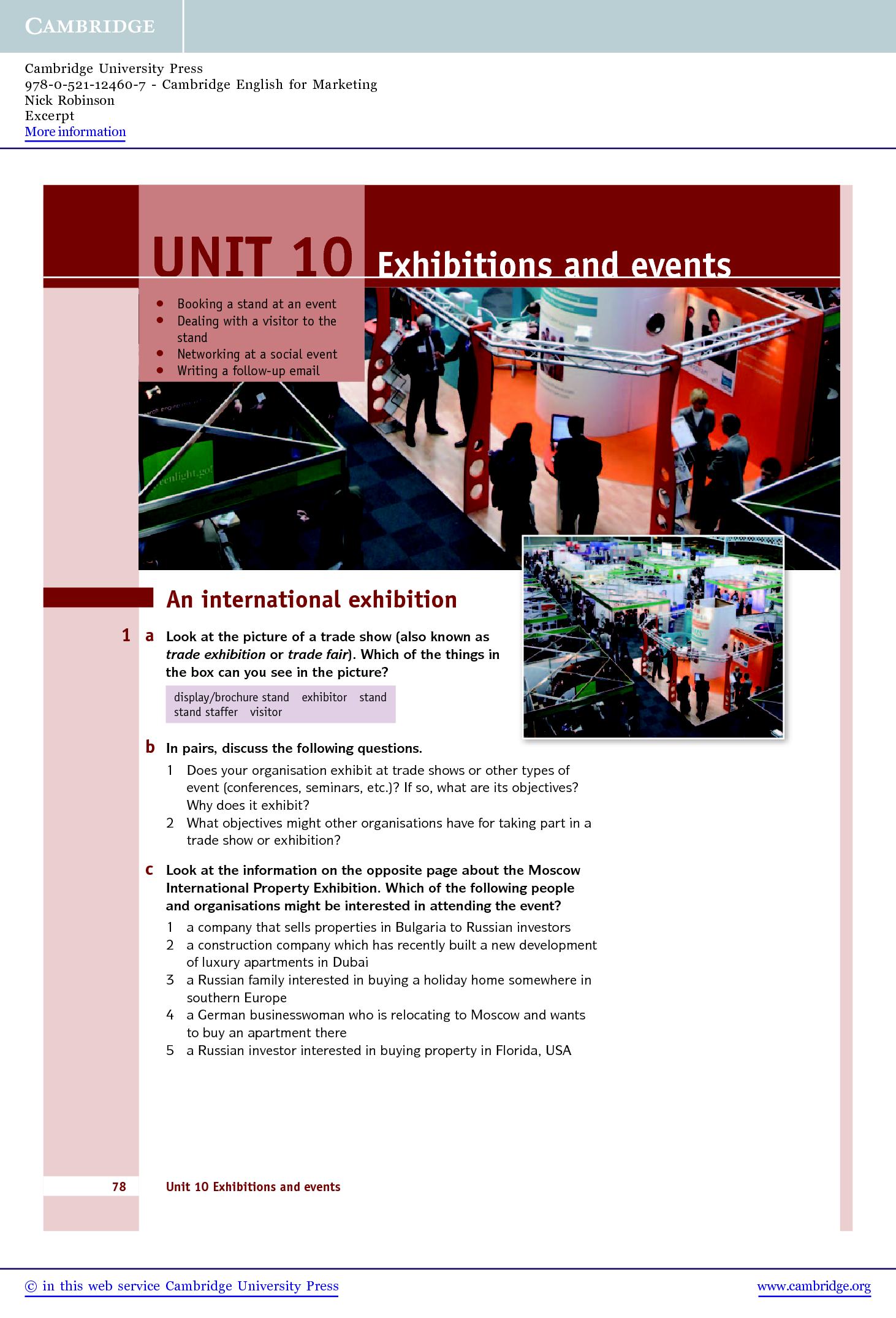 Cambridge English for Marketing covers a wide range of marketing topics, from understanding the role of marketing in an organisation through to launching a new product. The ten standalone units allow learners to focus on the areas of marketing most important to them and as well as teaching specialist vocabulary and marketing theory, the course also develops job-specific skills such as carrying out marketing audits, preparing marketing campaigns, organising events and developing digital marketing strategies.